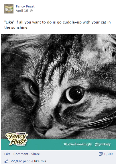People will share. Fancy Feast rocks this tactic all the time on Facebook, and their images get a lot of love. Always think about your brand’s content from the user’s perspective- not just the brand perspective.
